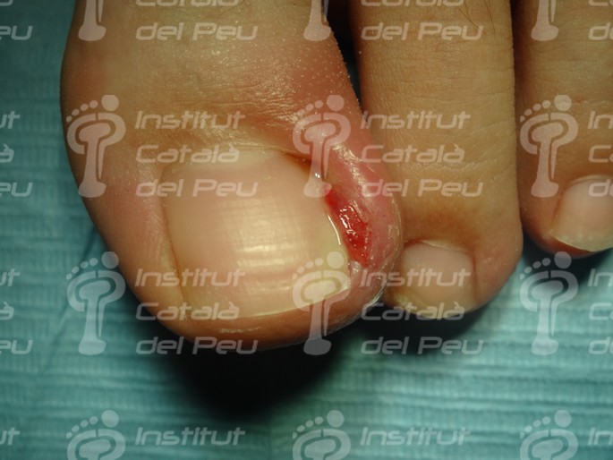 Onicocriptosi en estadi III. Observeu la presència d’un granuloma al canal tibial.