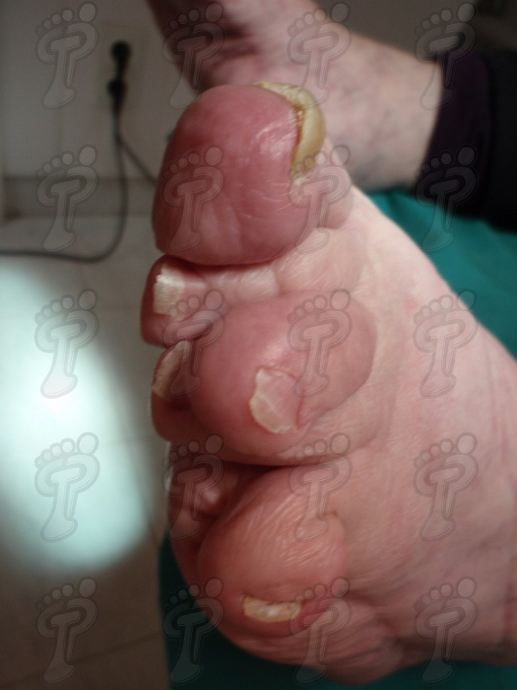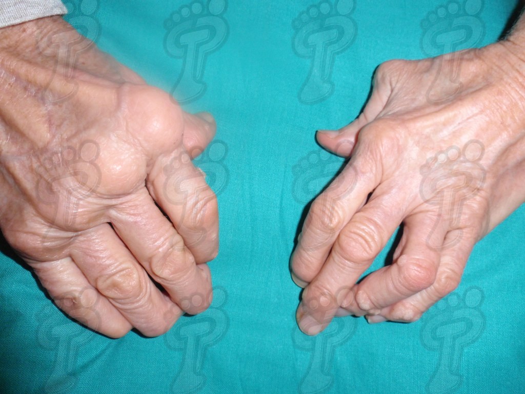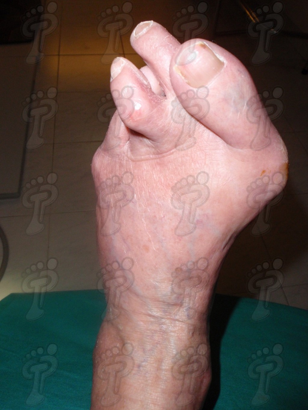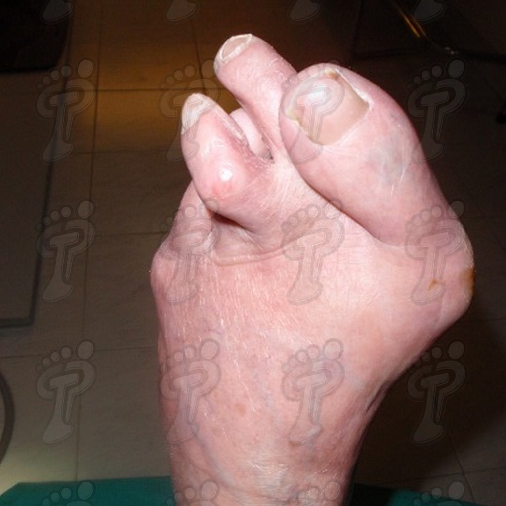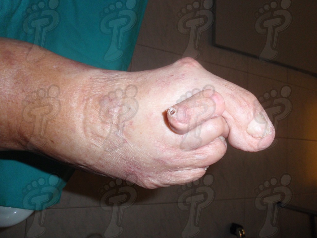 • La artropatía psoriática es una poliartritis crónica y de afectación articular asimétrica. En muchos casos aparece previamente psoriasis a nivel cutáneo. La afectación de los pies y manos es muy frecuente y suele ser un signo de aviso en fases iniciales de la enfermedad reumática que acaba afectando al total de pacientes en pocos años. Debido a ello, es aconsejable realizar una radiografía de los pies ante la sospecha de una enfermedad reumática para obtener un diagnóstico precoz. La deformación ósea progresiva es consecuencia de la carga que sostiene el pie (tengamos presente que son huesos pequeños y debilitados).