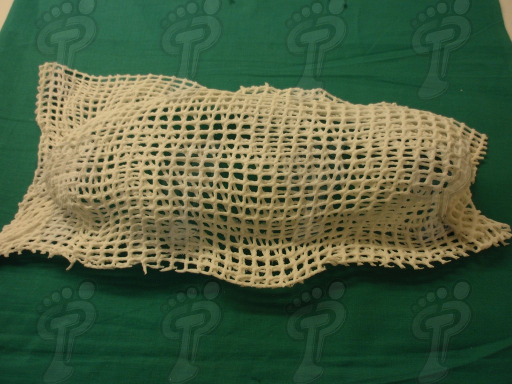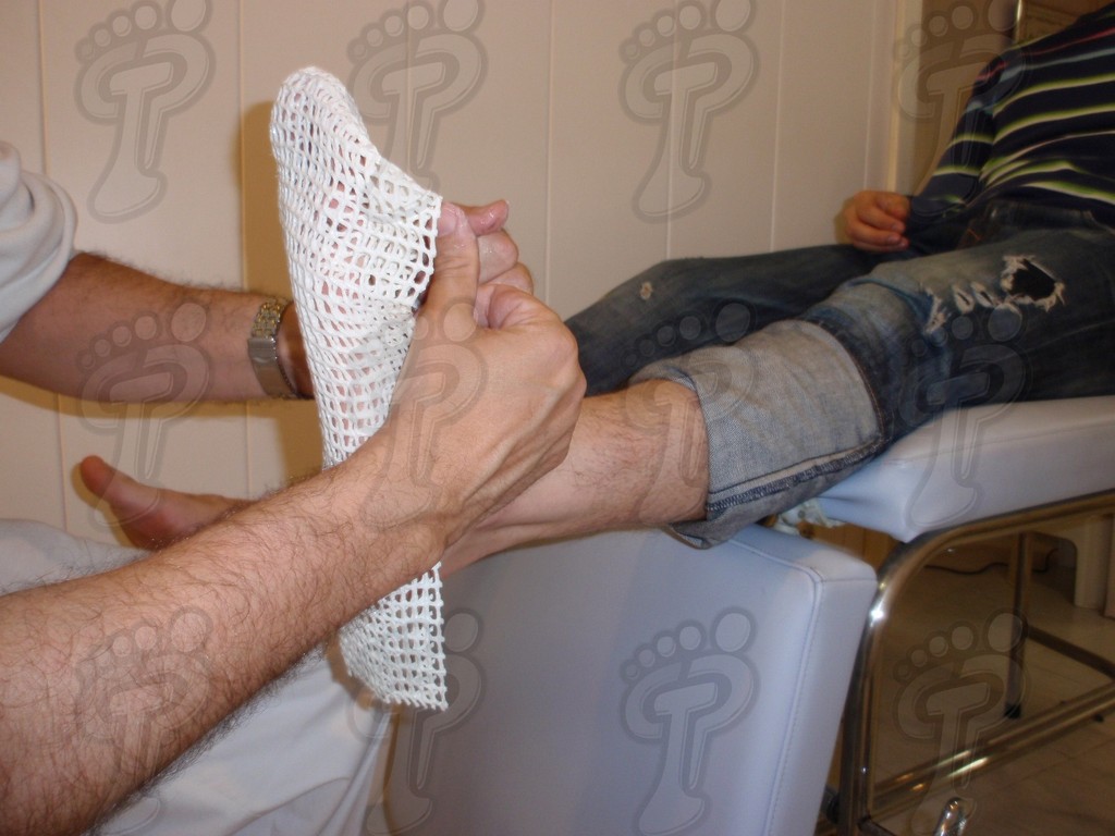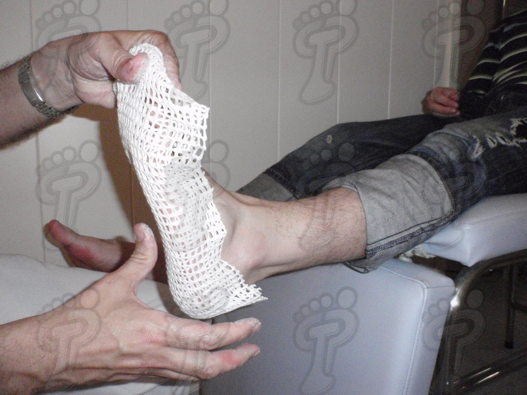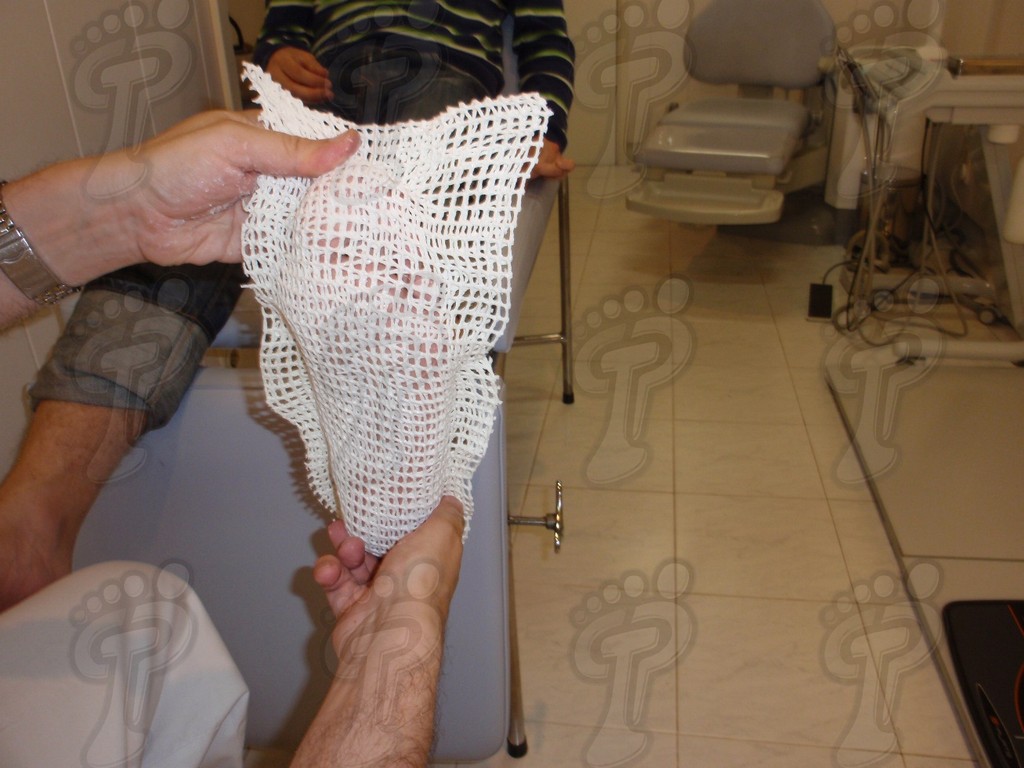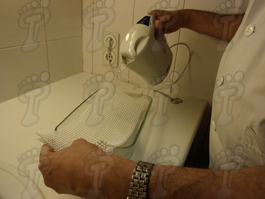 Es conocido por todos, la diversidad de métodos existentes para la confección de moldes del pie tales como el sistema de vacío, la espuma fenólica, sistema de carga, etc. Pero, la mayoría coincidiremos en que uno de los sistemas más fidedignos para la elaboración de un molde negativo de éste y, con toda probabilidad el más utilizado, es la aplicación de la venda de yeso sobre el pie en decúbito prono o supino. Si realmente es de los más precisos, ¿por qué no realizarle algunas mejoras? ¿Habéis pensado alguna vez, en la posibilidad de utilizar un material con las mismas características que la venda de yeso, pero sin los inconvenientes de ésta? Todas estas características las presenta el termoplástico biodegradable. Este material consiste en el mencionado termoplástico unido a un portador de algodón puro. La metodología será idéntica a la utilización con la venda de yeso, ya que como les hemos explicado, este material reúne las mismas características que la citada venda en cuanto a tiempo de fraguado, adherencia, flexibilidad, etc. La única diferencia respecto a la venda de yeso es que, para su adaptación, debe introducirse previamente en agua a 70º C durante cinco segundos.