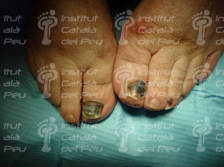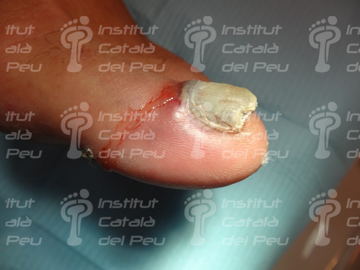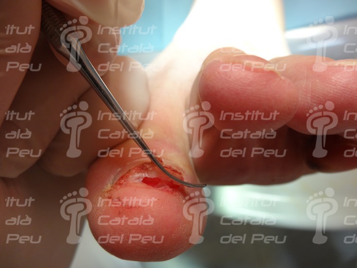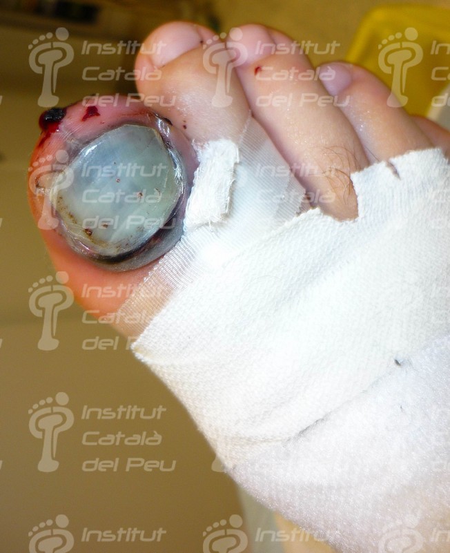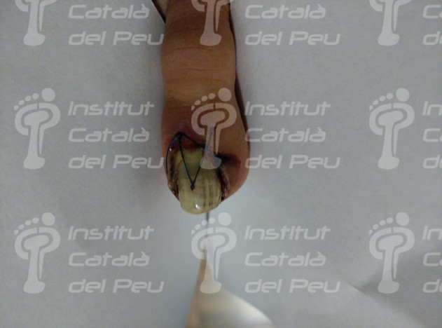 • Perforación de la uña mediante pequeños orificios para drenar la sangre acumulada debajo de la lámina ungueal. Debe realizarse en fases tempranas con el fin de evitar un mayor desprendimiento de  la lámina ungueal.