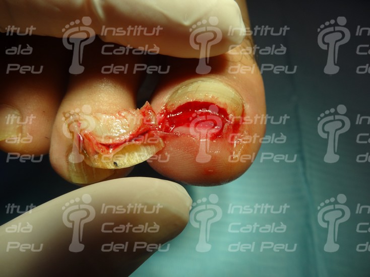 • Exéresis parcial o total de la uña siempre y cuando presente un arrancamiento del lecho ungueal debido al traumatismo. Retiraremos la porción de la uña una vez valorado el movimiento anómalo de esta y los posibles trastornos que nos parece provocar a posteriori su conservación.
