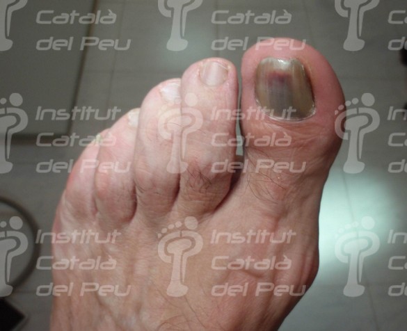 Se caracteriza por la rotura de vasos capilares del lecho ungueal provocando una hemorragia de sangre que queda depositada entre el lecho ungueal y la uña. Dicha extravasación de sangre provoca una presión sobre los tejidos adyacentes y por lo tanto dolor. En ocasiones, la presión ejercida por el hematoma rompe la epidermis y provoca un drenado espontáneo.