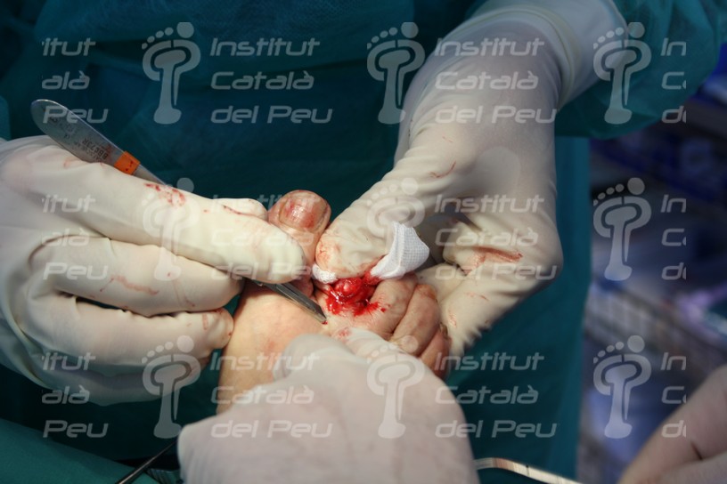 After the resection of the articular surface, we put a Kischner needle through the medium and distal phalanx in order to immobilize the foot’s toe tip and then the Kischner needle is reverted to the proximal phalanx. We will check by a fluoroscopy the location of the Kischner needle. We will suture by layers in a tightening way by a reabsorbable thread of 5/0 in capsule and with 4/0 reabsorbable the subcutaneous tissue and we will suture skin by silk 3/0. It is applied a bandage with gauzes covering the interventioned toe and making an anterior arch for the appropriate fixing of the metatarsal formula.