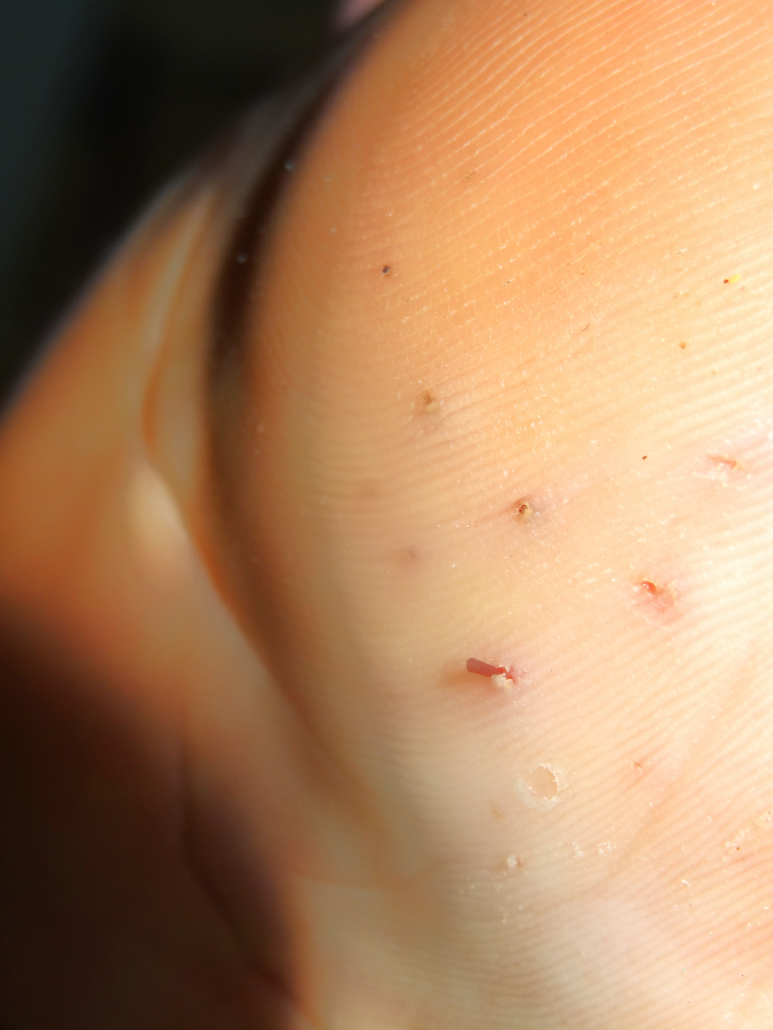 We define “strange substance” to any object of organic origin which comes from an external part of the human body. The strange substances with an organic origin can come from animals (hair, bones, etc.) or vegetables (wood, thorns, etc.). The organic substances are usually metallic, plastic or glass. It can come in a voluntary or an involuntary way on an area of the human body which it does not fit. On foot they are mainly located in the plantar area due to its connection to the load and the continued support of the digital area. We can synthetically see different cutaneous reactions in the area where the strange substance is placed such as an unspecific inflammatory reaction, the appearance of a hyperkeratosis which covers the dermis where the strange substance is located or arterial signs by an arterial lesion. To diagnose the appearance of a strange substance it should be advisable the physical examination or an image study being the radiologic tests a great help to visualize and to localize radiopaque or metallic strange substances. In some cases, it is necessary an examination by TAC or by an echography to visualize the strange substance. The treatment involves extracting with the aim of preventing infections and harm in the surrounding tissues. Therefore, we put aseptic in the area and then we extract the strange substance with some forceps and a bistoury. According to the depth and the kind of strange substance, it will be necessary to anesthetize previously the area to operate on. It will be applied antibiotic therapy according to a previous existence of infection. If the wound is deep or dirty, it should be advisable to put the antitetanus vaccine in case that the patient does not have an updated vaccination.