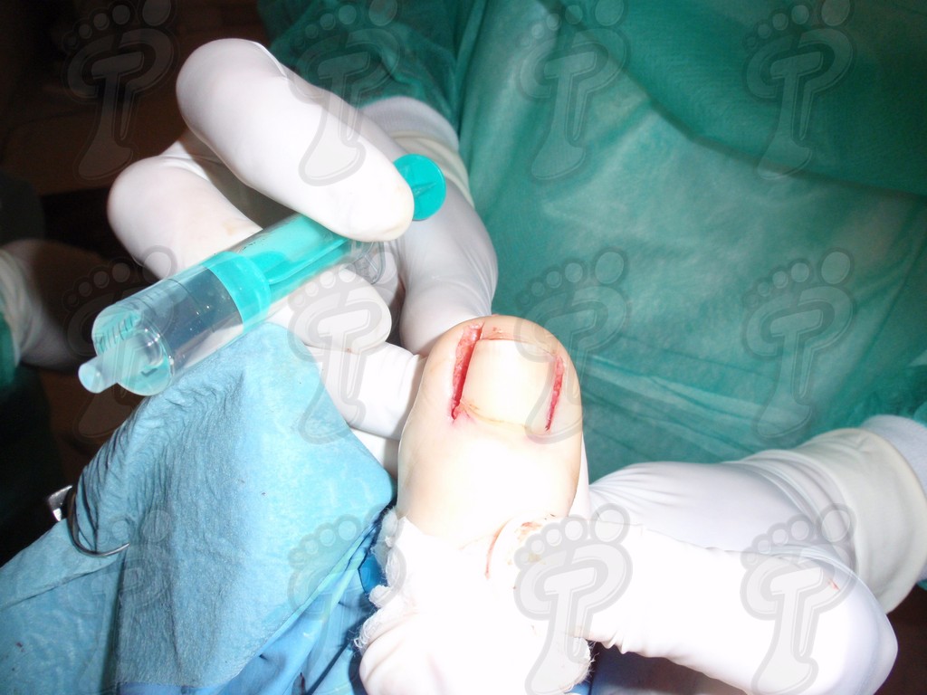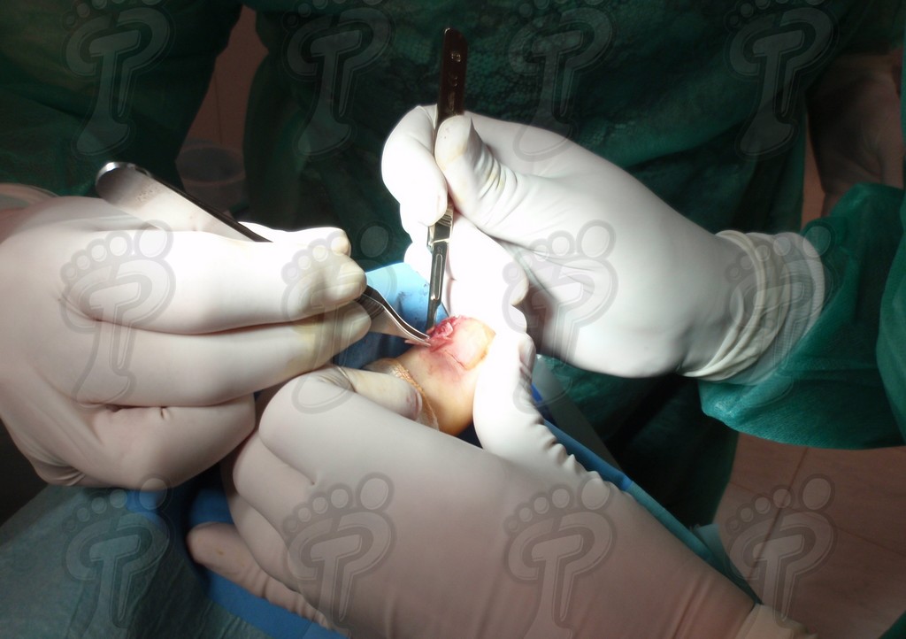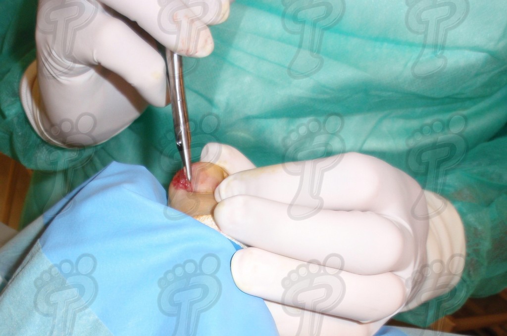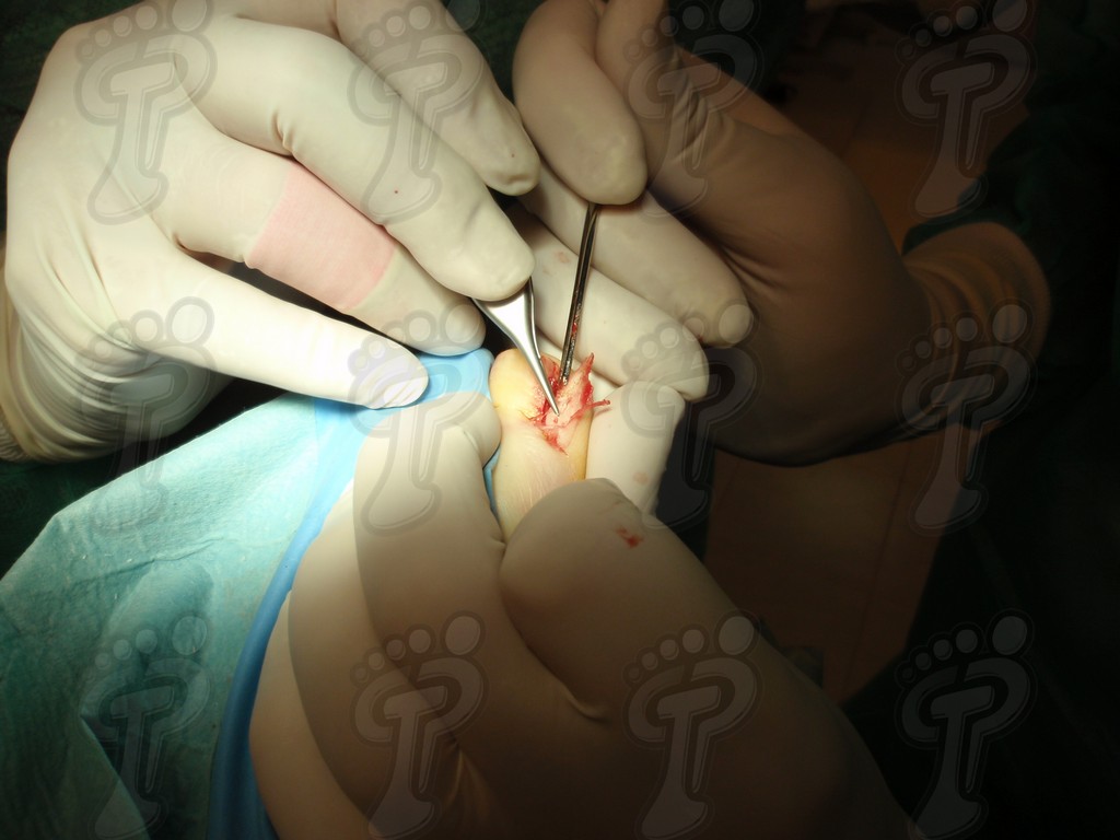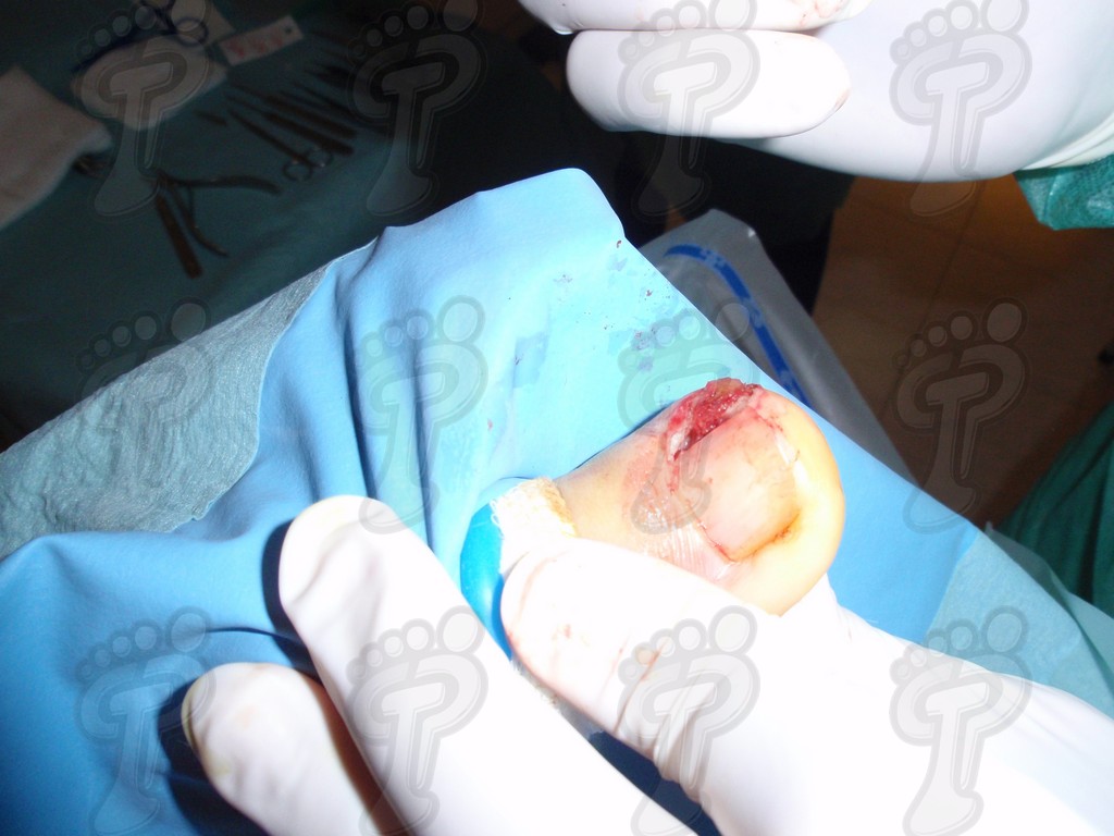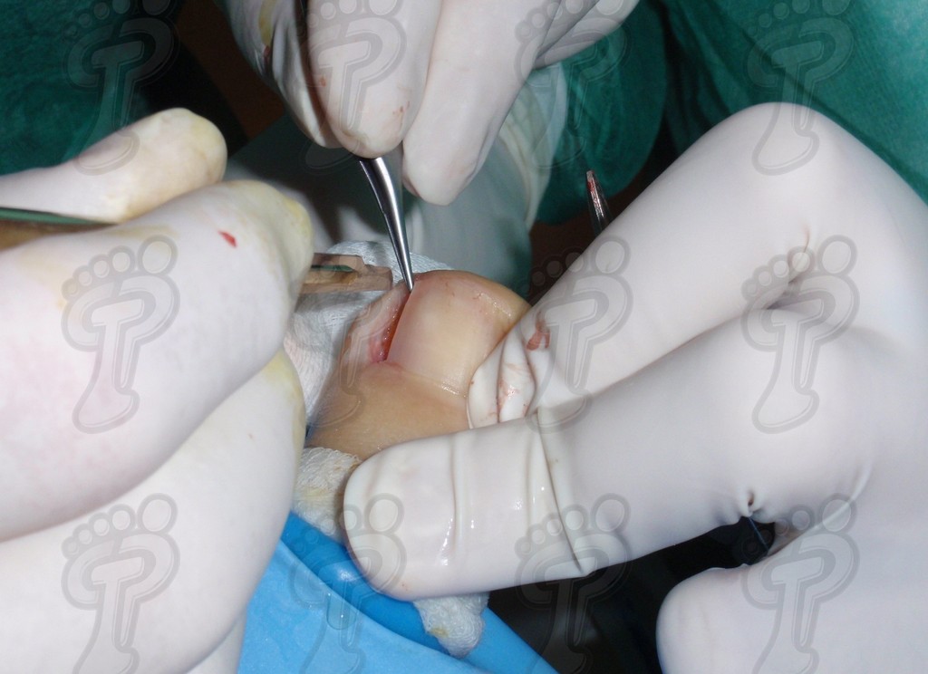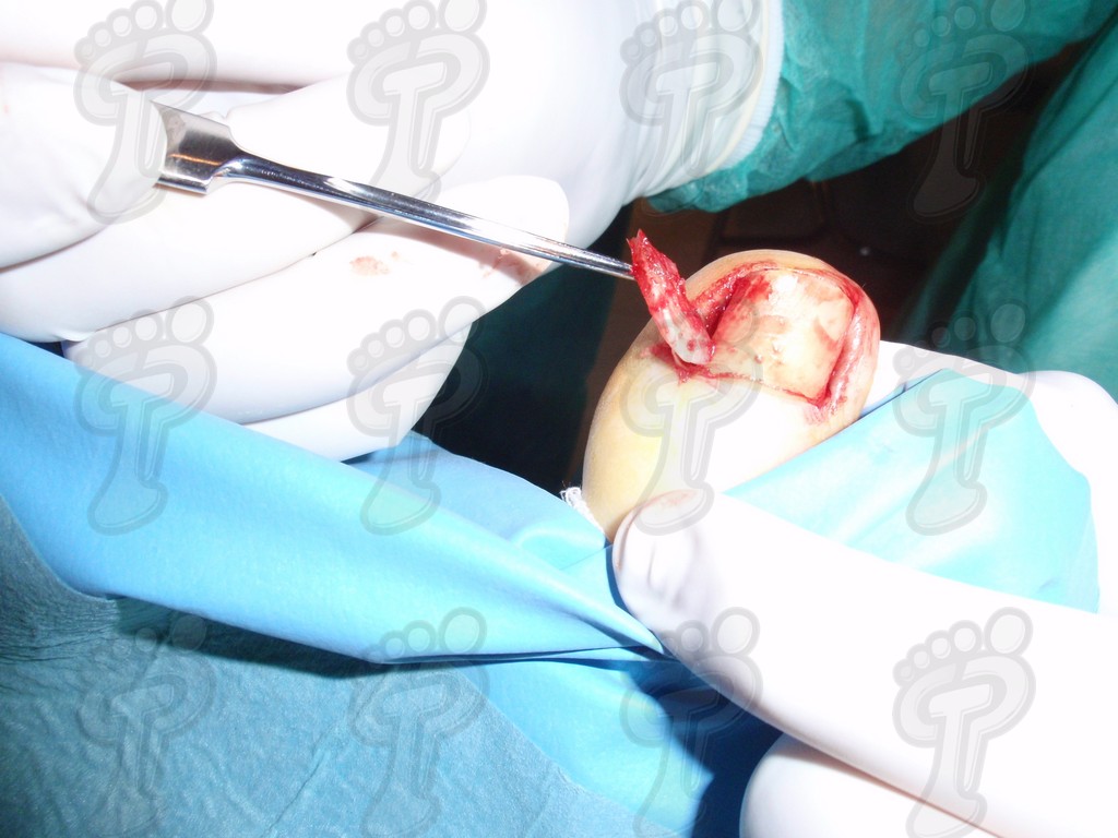 Previa anestesia y preparación del campo quirúrgico, desinsertamos la lámina ungueal de los tejidos adyacentes mediante una fina gubia o escoplo. Básicamente, hay que separar los rodetes periungueales, el lecho ungueal y el eponiquio. De esta forma podemos limitar la profundidad a la que se encuentra la matriz ungueal (clave para el proceso de legrado). El primer corte lo realizamos mediante una cizalla orientándola hacia la matriz y respetando un 80 % de la uña aproximadamente. Nos ayudamos de la gubia para retirar la espícula y legramos la matriz para evitar recidivas mediante una cucharilla de Martini. Se legra en todas las direcciones excepto al sentido de la lámina ungueal a respetar, evitando así alteraciones de ésta. Si existe tejido hipertrofiado o desvitalizado por antiguos procesos inflamatorios e infecciosos, procedemos a su exéresis mediante bisturí. Esta limpieza quirúrgica no deja de ser una reconstrucción plástica con la finalidad de una estética correcta del dedo y restando las posibilidades de una recidiva. La técnica de reconstrucción tiene como objetivo la perfecta aproximación de los bordes quirúrgicos sin tensión, mediante un corte profundo paralelo a la lámina ungueal, desde eponiquio al punto más distal de la uña, y otro corte parabólico, en el mismo sentido que el anterior, abarcando todo el tejido a extraer.