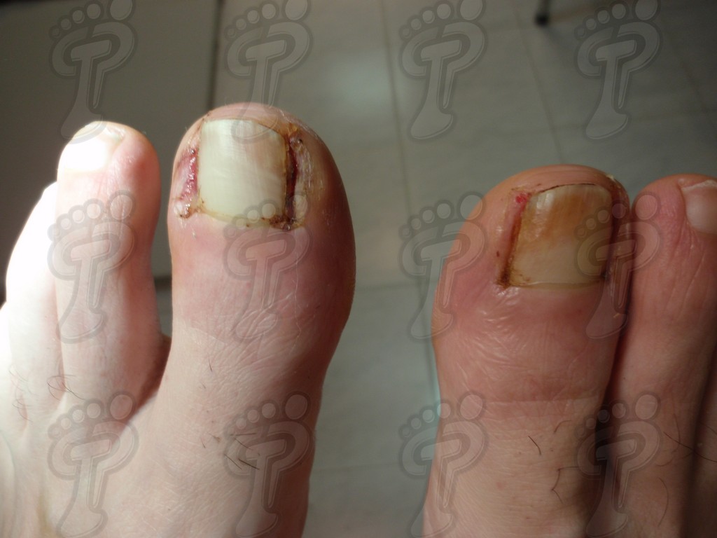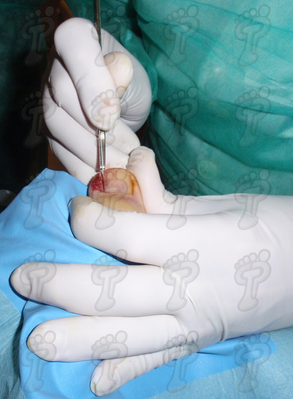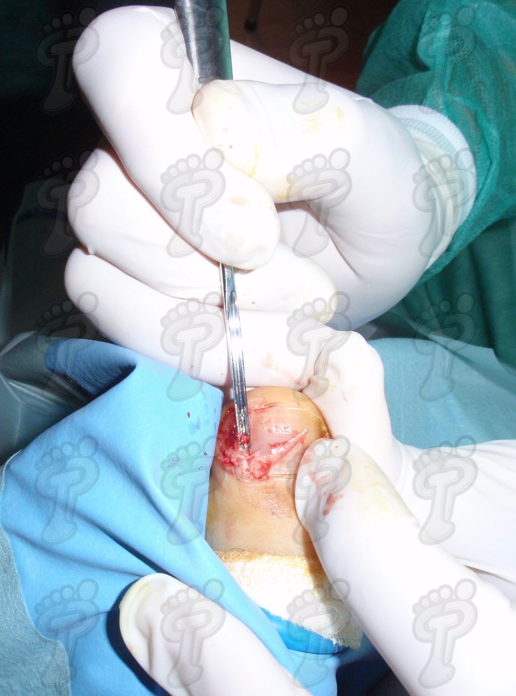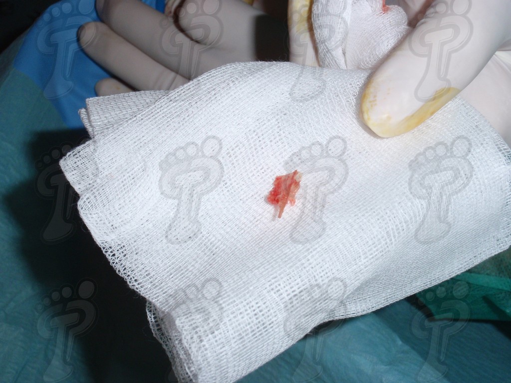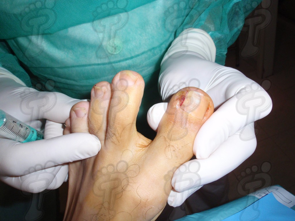 Previa anestesia y preparación del campo quirúrgico, desinsertamos la lámina ungueal de los tejidos adyacentes mediante una fina gubia o escoplo. Básicamente, hay que separar los rodetes periungueales, el lecho ungueal y el eponiquio. De esta forma podemos limitar la profundidad a la que se encuentra la matriz ungueal (clave para el proceso de legrado). El primer corte lo realizamos mediante una cizalla orientándola hacia la matriz y respetando un 80 % de la uña aproximadamente. Nos ayudamos de la gubia para retirar la espícula y legramos la matriz para evitar recidivas mediante una cucharilla de Martini. Se legra en todas las direcciones excepto al sentido de la lámina ungueal a respetar, evitando así alteraciones de ésta. Si existe tejido hipertrofiado o desvitalizado por antiguos procesos inflamatorios e infecciosos, procedemos a su exéresis mediante bisturí. Esta limpieza quirúrgica no deja de ser una reconstrucción plástica con la finalidad de una estética correcta del dedo y restando las posibilidades de una recidiva. La técnica de reconstrucción tiene como objetivo la perfecta aproximación de los bordes quirúrgicos sin tensión, mediante un corte profundo paralelo a la lámina ungueal, desde eponiquio al punto más distal de la uña, y otro corte parabólico, en el mismo sentido que el anterior, abarcando todo el tejido a extraer.