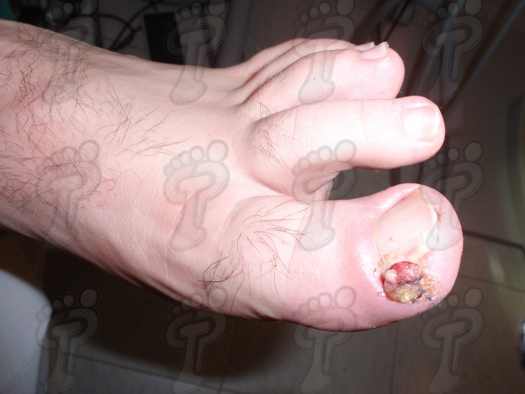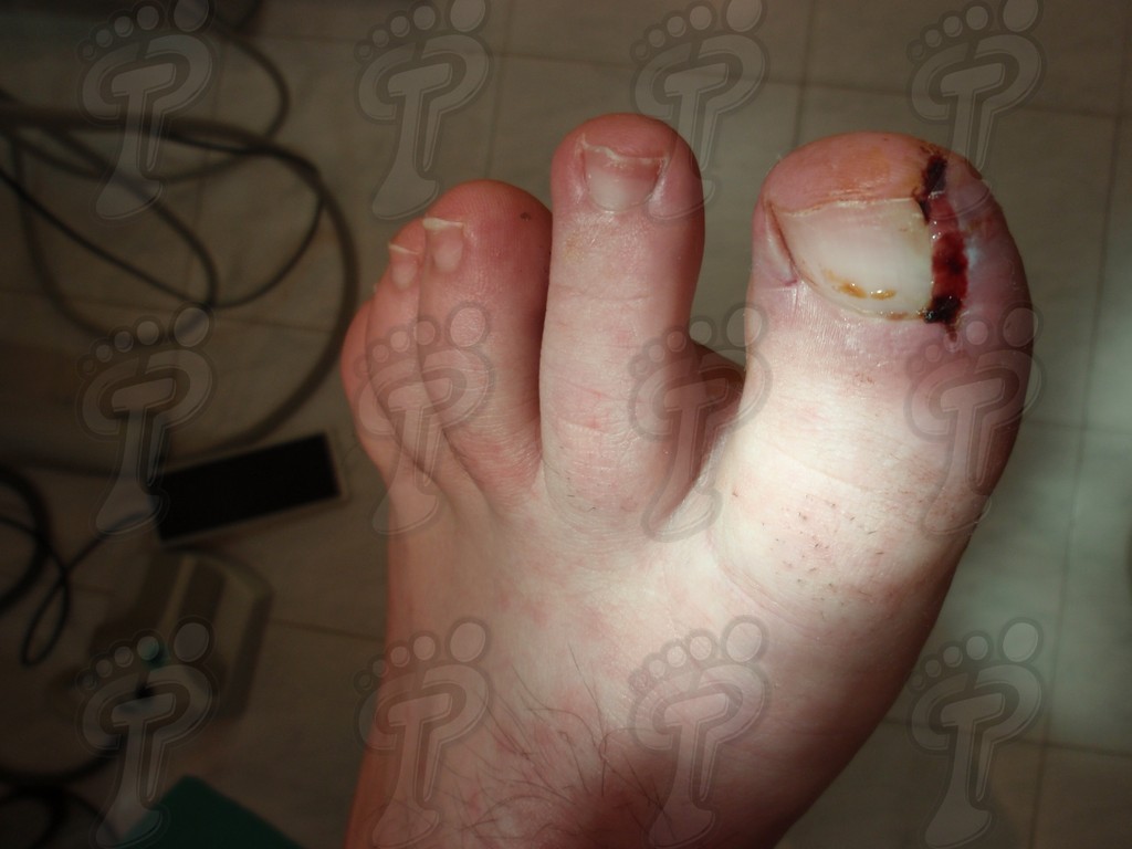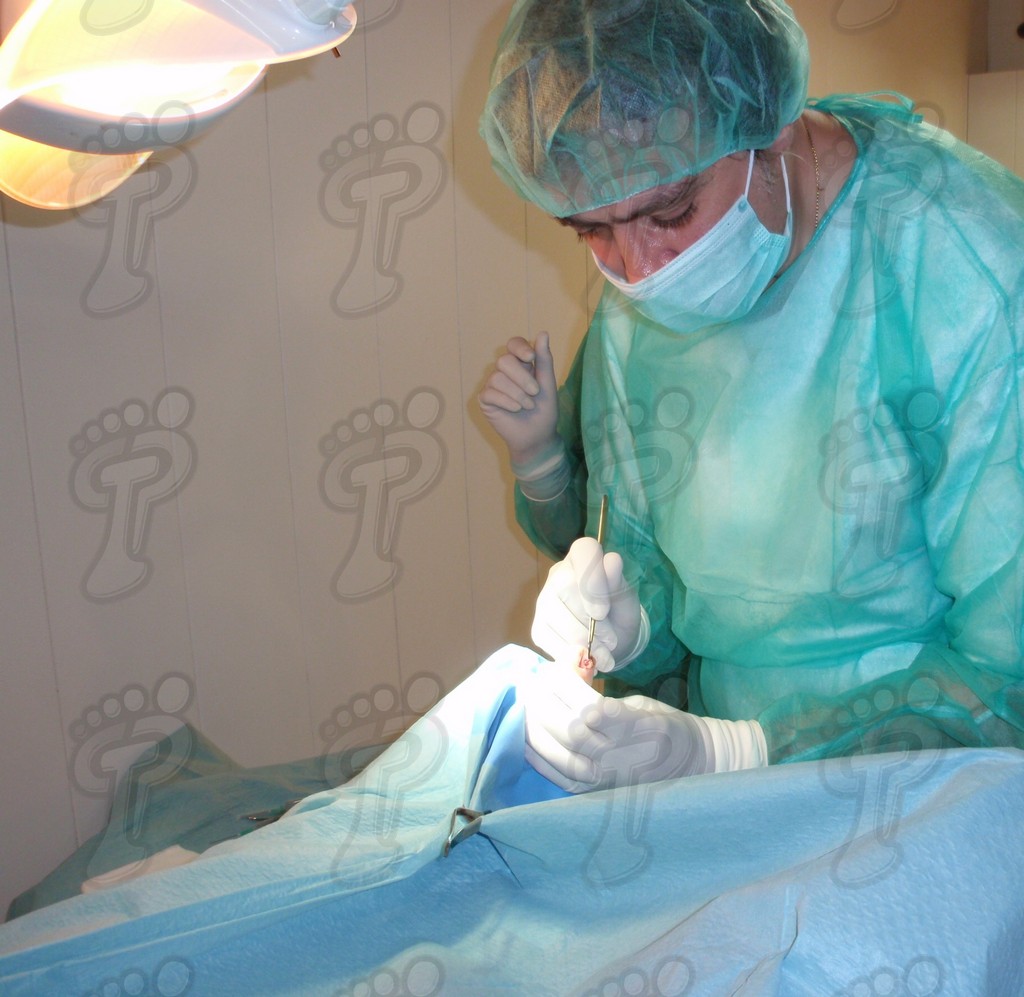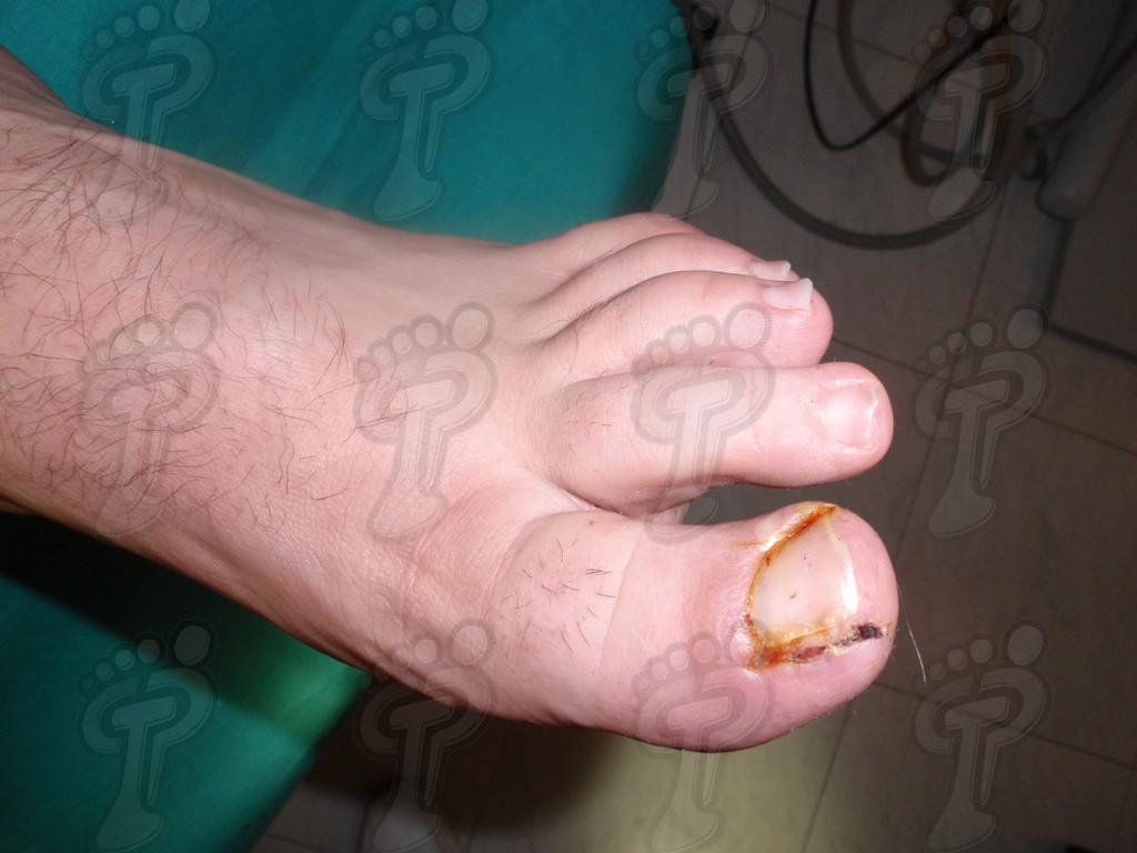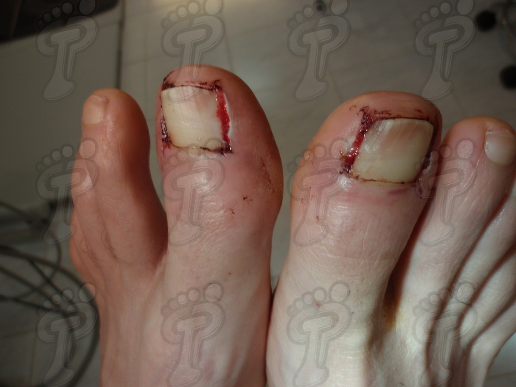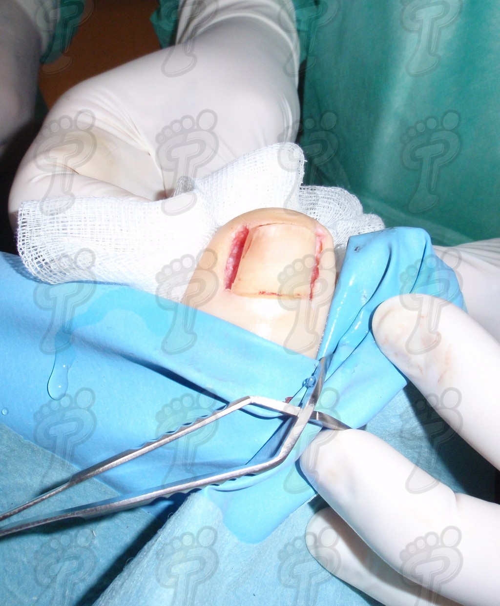 Previa anestesia y preparación del campo quirúrgico, desinsertamos la lámina ungueal de los tejidos adyacentes mediante una fina gubia o escoplo. Básicamente, hay que separar los rodetes periungueales, el lecho ungueal y el eponiquio. De esta forma podemos limitar la profundidad a la que se encuentra la matriz ungueal (clave para el proceso de legrado). El primer corte lo realizamos mediante una cizalla orientándola hacia la matriz y respetando un 80 % de la uña aproximadamente. Nos ayudamos de la gubia para retirar la espícula y legramos la matriz para evitar recidivas mediante una cucharilla de Martini. Se legra en todas las direcciones excepto al sentido de la lámina ungueal a respetar, evitando así alteraciones de ésta. Si existe tejido hipertrofiado o desvitalizado por antiguos procesos inflamatorios e infecciosos, procedemos a su exéresis mediante bisturí. Esta limpieza quirúrgica no deja de ser una reconstrucción plástica con la finalidad de una estética correcta del dedo y restando las posibilidades de una recidiva. La técnica de reconstrucción tiene como objetivo la perfecta aproximación de los bordes quirúrgicos sin tensión, mediante un corte profundo paralelo a la lámina ungueal, desde eponiquio al punto más distal de la uña, y otro corte parabólico, en el mismo sentido que el anterior, abarcando todo el tejido a extraer.