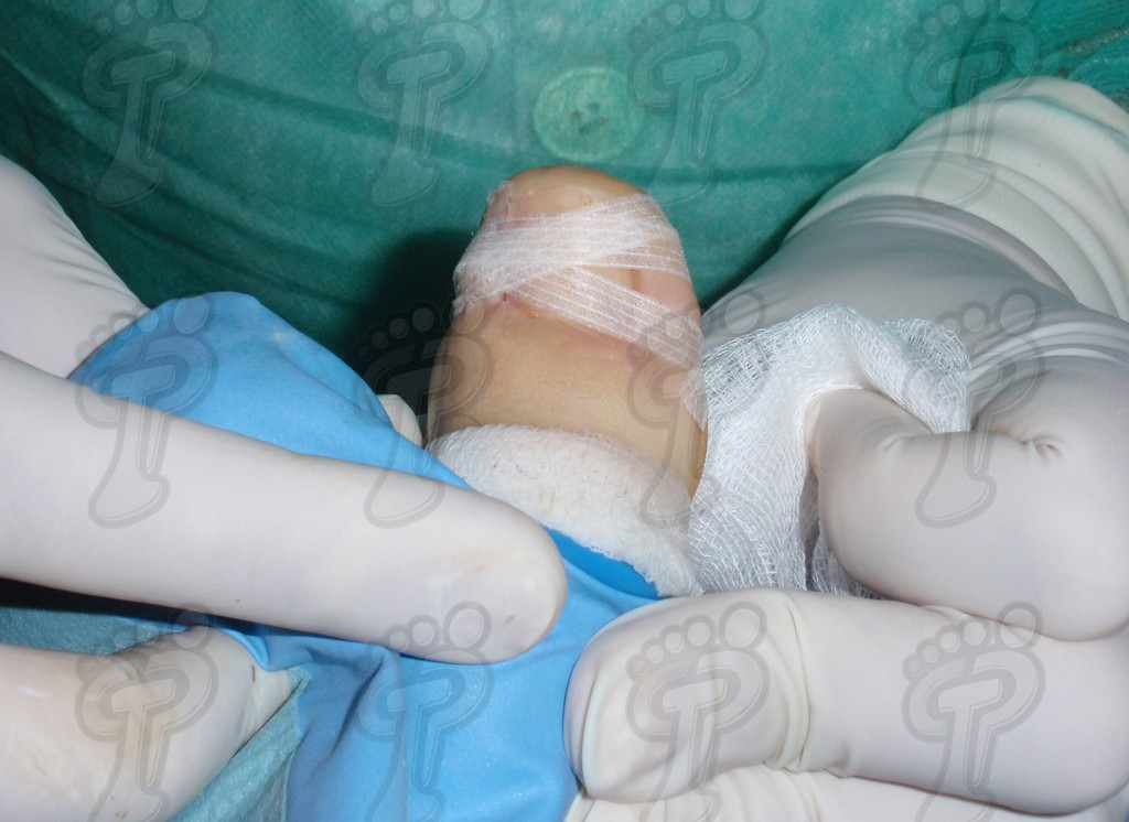 Para el lector que no esté familiarizado con la cirugía, la forma del corte se asemejaría a un gajo de naranja. Cuando el tejido extirpado impide una buena coaptación de los bordes quirúrgicos, recurrimos a la técnica de Winograd. Esta técnica es similar a la reconstrucción estética pero comprende desde un punto distal al eponiquio a otro del hiponiquio (5 milímetros aproximadamente en ambos casos). Terminada la técnica, procedemos al lavado quirúrgico con suero fisiológico y unimos la herida quirúrgica mediante tiras de aproximación.